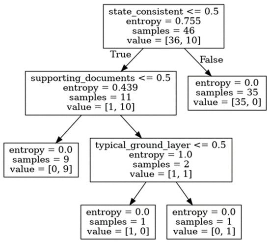 First, the supporting documents marker was used to split the subset into two child nodes. Again, the left one corresponded to negative or missing values of the marker. The second split in the left node, based on the supporting documents, created two child subsets. The left child consisted of nine samples and was already pure. In other words, all the samples with both state consistent and supporting documents markers with values −1 and 0 were forged. The right child consisted of only two samples, one authentic and one not, which could be separated from each other by the application of yet another marker, the typical ground layer.