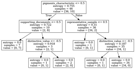 The decision trees can also be used to check the consequences of feature removal from the training set. For instance, assume that there is no “state consistent” marker in the data or that this subjective marker has been intentionally removed by an expert. The tree built for that case is shown in Figure 6. The new model requires more features to separate both classes. However, it is still possible to achieve full separation with a rather short tree. The marker called “pigments characteristic” becomes the most important one and allows for a division of the painting into two child nodes with 10 (two authentic and eight forged) and 36 (34 authentic and two forged) samples. The importance of all markers used in the tree are summarized in Table 6. Again, the revised model displays 88% accuracy in predicting a painting’s authenticity when applied to the test data.