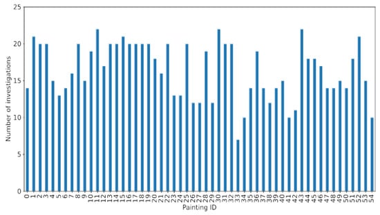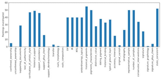 Our dataset consisted of 55 paintings, 43 of which were assessed as authentic (see Table 2 and Table 3 for details). The investigations performed for each item are shown in Figure 7 (to recall, each investigation corresponds to one attribution marker). The paintings differed from each other in the number and type of tests conducted to check their authenticity. In other words, there was no standard set of attributes the examining laboratories checked during the authenticity assessment. In fact, as is shown in Figure 5 and Table 2 and Table 3, the presented dataset did not include any sample with all 32 markers collected.