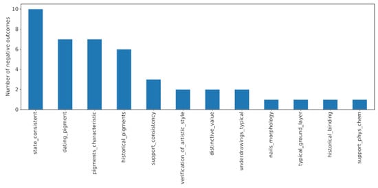 In Figure 9, the investigations with negative outcomes are shown. The analyzed dataset suggests some level of differentiation in the importance/contribution of given authenticity marker to the overall investigation. Three out of four markers with the highest negative outcome were associated with the pigment analysis (“dating_pigment”, “pigments_characteristic” and “historical_pigments”). Such results underline the significance of the pigment analysis in the overall authentication process. In the case of the “dating_pigment” marker, any negligence in identifying all the places in which conservation work was performed can result in erroneous authenticity attribution. The highest number of negative outcomes was assigned to the “state _consistent” marker. In the next section, this marker is discussed in more detail. Nevertheless, the attribution markers shown in the figure are of great importance. Since one expects a painting with all positive examinations to be authentic, the forged category has to be related to negative values of the markers.