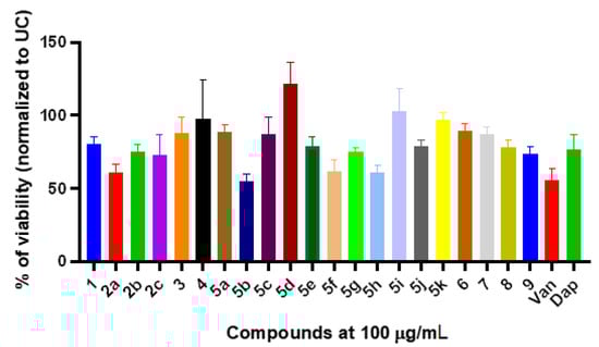 Cytotoxicity of the compounds was evaluated using MTT assay. Vero African green monkey kidney cells were exposed to the 100 µg/mL of each compound or vancomycin and daptomycin (control) for 48 h (37 °C; 5% CO2) in Eagle’s minimum essential medium supplemented with 10% FBS, 1X PenStrept, 1X Glutamax. After incubation, the MTT was added, and viability was determined by measuring the absorbance of the reduced formazan at 570 and 600 nm. The absorbance measured at 600 nm was automatically subtracted from the absorbance at 570 nm to eliminate the effects of nonspecific absorption. The percent cytotoxicity achieved by the compounds was calculated according to standard methods and normalized to untreated control (UC).