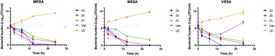 The in vitro time-kill studies of most potent compounds 2a–c against Staphylococcus aureus harboring genetically defined resistance mechanisms. The representative S. aureus strains (MRSA, MSSA, VRSA) were exposed at MIC concentration of compounds 2a–c or vancomycin for 24 h. The viable bacterial numbers in treatment groups or untreated control (UC) were calculated after dilution and plating. Data provided in the graphs are mean ± SD from 3 experimental replicas.