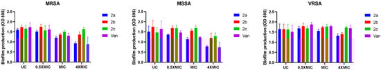 The activity of compounds 2a–c on the Staphylococcus aureus biofilm integrity. The S. aureus biofilms were exposed with increasing concentrations of compounds 2a–c or vancomycin (Van) for 24 h. After exposure with the test compounds, the biofilm integrity was evaluated by crystal violet assay. Data provided in the graphs are mean ± SD from 3 experimental replicas.