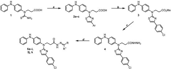 Synthesis of thiazoles 2–5. 2a, Ar = 4-FC6H4; 2b, Ar = 4-ClC6H4; 2c, Ar = 4-BrC6H4; 5a, R = C6H5; 5b, R = 4-FC6H4; 5c, R = 4-ClC6H4; 5d, R = 4-BrC6H4; 5e, R = 4-O2NC6H4; 5f, R = 4-Me2NC6H4; 5g, R = 4-MeC6H4; 5h, R = thien-2-yl; 5i, R = 5-nitrothien-2-yl; 5a–i, R1 = H; 5j, R = R1 = Me; 5k, R = Et, R1 = Me. Reagents and conditions: (a) 10% Na2CO3, MeOH, 2-bromo-4′-substituted acetophenone, Δ, 2 h (a,b), 4 h (c), 30% AcOH to pH 6, 68–88%; (b) MeOH, H2SO4, Δ, 5 h, 10% Na2CO3, 80%; (c) N2H4∙H2O, 2-PrOH, Δ, 18 h, H2O, 73%; (d) RCHO, AcOH, 2-PrOH, Δ, 2 h (5a–i), Me2CO (5j) or MEK (5k), Δ, 5 h, 68–95%.