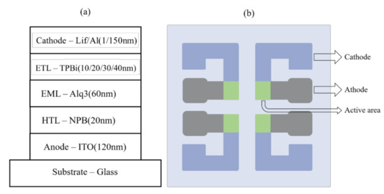 In the experiment, we used a 0.3 × 0.3 cm2 active area basic un-doped OLED with a three-layered structure. The cathode consisted of aluminum (Al) deposited on lithium fluoride (LiF). The HTL consisted of N,N′-di[(1-naphthyl)-N,N′-diphenyl]-(1,1′-biphenyl)-4,4′-diamine (NPB). Alq3 acted as an emitting layer (EML). The ETL consisted of 2,2′,2″-(1,3,5-Benzinetriyl)-tris(1-phenyl-1-H-benzimidazole) (TPBi). The device structure is shown in Figure 1. All organic layers were deposited under high-vacuum conditions of 1.2 × 10−6 Torr, and the OLED devices were transferred directly into an automated laser processing system with 10 L/min of nitrogen (N2) gas for encapsulation.