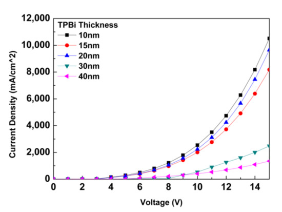 When the thickness of TPBi was changed and calculated according to the SCLC theory, the current density at a thickness of 10 nm was obtained, and the maximum value was 10,510 mA/cm2. The current density at the maximum thickness of 40 nm was the minimum value of 1350 mA/cm2. However, at a thickness of 15 nm, there was a current density of 8178 mA/cm2. When the thickness was 20 nm, the current density was 9644 mA/cm2, and the current density was 2479 mA/cm2 at a thickness of 30 nm. As the SCLC theory does not take the capacitance and resistance effects of organic light-emitting diodes into account, this theory does not allow us to know the maximum breakdown voltage of the device. The effective circuit of the device and the cause of device breakdown are discussed. It could be known that the charge density of holes decreases slowly after 4 V. With an external bias voltage of 3 to 10 V, the charge density of the electrons gradually approached the charge density of the holes. As the charge density of the electrons was not close to the charge density of the holes and was gradually increasing, there was a gradual decrease in the combination rate of electrons and holes at an interface thickness of 20 nm. Eventually, the charge density of the electrons was much greater than the charge density of the holes.