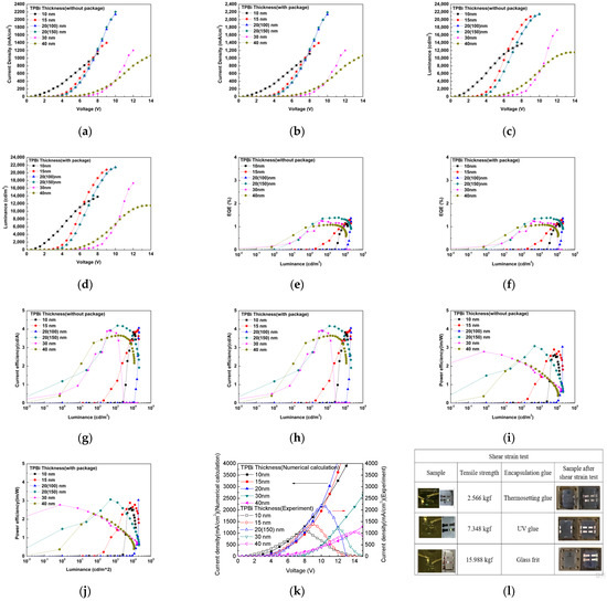 Results under the different TPBi thicknesses for the current density and voltage (a) without packaging and (b) with packaging; luminance and voltage (c) without packaging and (d) with packaging; EQE and luminance (e) without packaging (f) and with packaging; the current efficiency and luminance (g) without packaging and (h) with packaging; power efficiency and luminance (i) without package (j) and with packaging (k); and the current density and voltage in the numerical calculation and experiment. (l) Shear strain test for the OLED device with encapsulation.