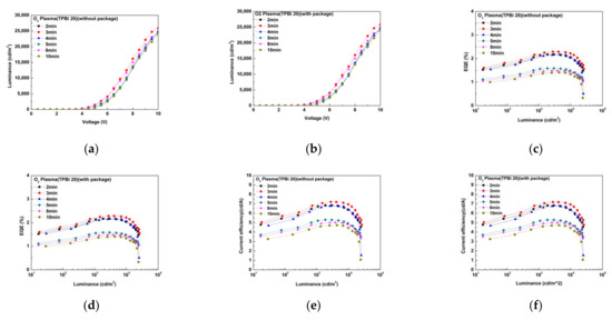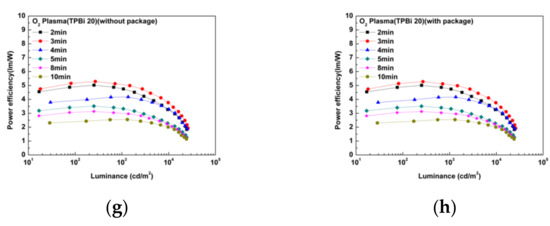 Results under the different oxygen plasma bombardment times for luminance and voltage (a) without packaging and (b) with packaging; EQE and luminance (c) without packaging and (d) with packaging; current efficiency and luminance (e) without packaging and (f) with packaging; and power efficiency and luminance (g) without packaging and (h) with packaging.