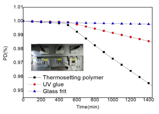 As shown in Figure 6, an OLED device burned-in with thermosetting glue obtained a decay of 0.99813 at 8 h, 0.97479 at 16 h, and 0.95358 at 24 h. An OLED device burned-in with UV glue obtained a decay of 0.99893 at 8 h, 0.98482 at 16 h, and 0.97130 at 24 h. An OLED device burned-in with glass frit glue obtained a decay of 0.99896 at 8 h, 0.99833 at 16 h, and 0.99780 at 24 h. Finally, the lifetime of the OLED device was calculated to be 20 days with thermosetting glue, 60 days with UV glue, and 1026 days with glass frit glue.
