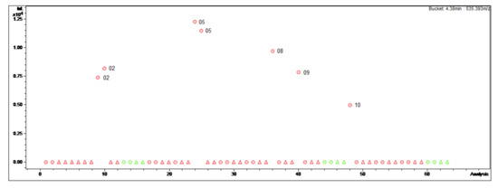 The result of the t-test calculation is illustrated in the volcano plot (Figure 8), which displays differences between samples obtained from twigs and leaves. In the volcano plot, the negative decadic logarithm of the p-value (significance) is plotted against the binary logarithm of the fold change (quantity change of a compound between both groups). Of particular interest are signals (buckets) with a high fold change and a significant p-value, although greater attention was paid to the fold change. This eliminates signals that show significant differences between sample types, which are, however, irrelevant due to their small intensity. Once more, the LC/MS spectra (Table 4) of the compounds underlying the interesting buckets were analyzed.
