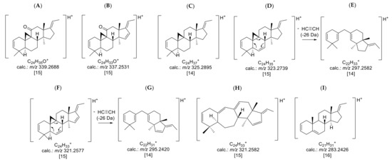 Prominent core fragments of the investigated nor-triterpene alkaloids of the nor-cycloartane type from B. sempervirens: (A) core fragment m/z 339 for fully saturated C-3/C-20 diamines with a ketone substituent; (B) core fragment m/z 337 for C-3/C-20 diamines with a ketone substituent possessing one additional substitution or double bond; (C) core fragment m/z 325 for fully saturated C-3/C-20 diamines; (D) core fragment m/z 323 for C-3/C-20 diamines possessing one additional substitution or double bond; (E) core fragment m/z 297 for C-3/C-20 diamines with a Δ6; (F) core fragment m/z 321 for C-3/C-20 diamines doubly substituted or unsaturated; (G) core fragment m/z 295 for C-3/C-20 diamines with a Δ6 and one further substitution or unsaturation; (H) core fragment m/z 321 for C-3/C-20 diamines of (9-(10→19))abeo-5α-pregnane possessing one additional substitution or double bond; (I) core fragment m/z 283 for steroidal alkaloids with a C-3/C-20 substitution possessing one additional double bond or substitution. The postulated positions of unsaturation and substitution are based on the already known structures of compounds 19, 22 and 26 [3,17].