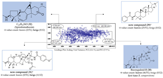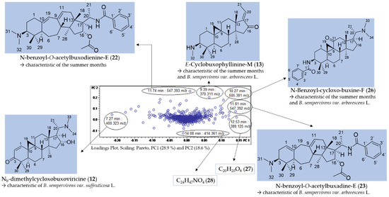 Compounds 22, 13 and 26 were highlighted by the PCA model (Figure 5) as characteristic constitutions of summer months with particularly high loadings on PC2, while compounds 13, 26 and 23, with high loadings on PC1, were indicated as characteristic compounds of B. sempervirens var. arborescens, distinguishing it from var. suffruticosa. In contrast, Nb-dimethylcycloxobuxoviricin (12) turned out to be characteristic of B. sempervirens var. suffruticosa due to the far-left orientation in the loadings plot (Figure 5).