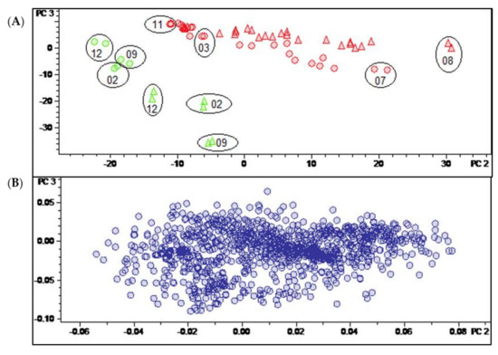 Having thus identified the main determinants of differences between the two varieties and of temporal variation in their pattern of constituents, it was an interesting question as to whether it would also be possible to identify constituents characteristic for a distinction between the leaves and twigs. In this case, the Pareto-scaled PCA model did not yield such clear results as described above for the distinction between varieties and time dependent changes. It can be seen in the scores plot of this model shown in Figure 3A that the twig samples (green) appear at the “lower ends” of the two variety groups, i.e., at more negative values of PC2. In that respect, they resemble leaf samples obtained in the winter months. A very similar behavior is also observed in the corresponding plot of PC2 vs. PC1 of the model obtained with unit variance-scaled (UVS) data (Figure S2, Supplementary Materials). Quite interestingly, the distinction between leaf and twig samples becomes more evident when a scores plot of the third vs. second PC of the UVS model is inspected (see Figure 6A). In this plot, the samples of the two organs appear completely separate due to the differences from the leaf samples on PC2 and PC3. This is also the case in the second vs. first PC of the model with level scaling (Figure S3, Supplementary Materials) but, interestingly, none of the PCs of the PS model represent this distinction in such a clear manner.