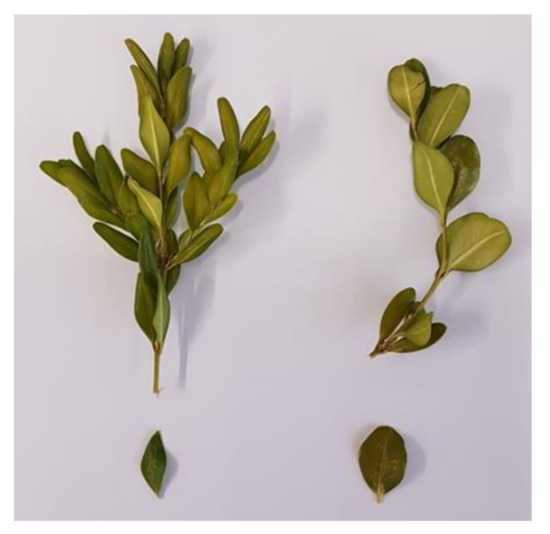The plant material, as in our previous studies [3,4], was obtained from a hedge growing on a private estate in Havixbeck, Germany (GPS coordinates are available from the corresponding author on request). Within one year (February 2019–January 2020), shoot tips of the same box hedge as in our previous studies [3,4,14] were harvested each month in order to create a seasonal profile of B. sempervirens L. This hedge is composed of two varieties with rounded and pointed leaves, respectively (Figure 10), with the one with pointed leaves being clearly predominant in proportion. Based on the literature [5,6], the variety with pointed leaves was identified as B. sempervirens var. arborescens L., and the variety with rounded leaves was identified as B. sempervirens var. suffruticosa L. In addition to the various harvesting times and the two different varieties, a distinction was made between the organs by separating leaves from twigs.