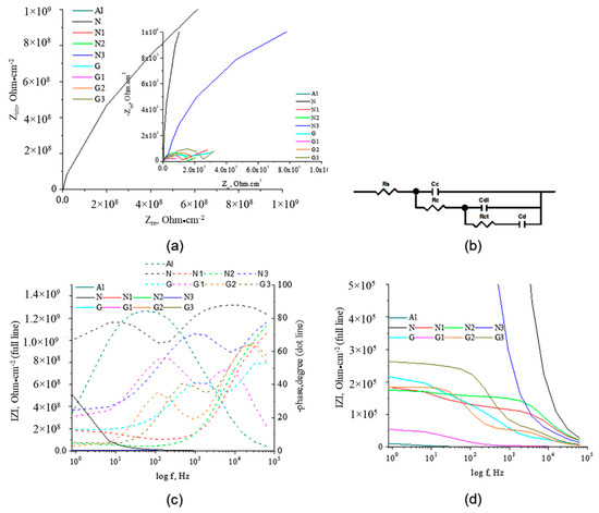 Diagrams (a) Nyquist and detailed Nyquist; (b) electric equivalent circuit; (c) Bode impedance modulus IZI and phase angle, and (d) detailed IZI versus log f, for all electrodes after 60 min immersion in 3% NaCl solution at potential OCP, V.