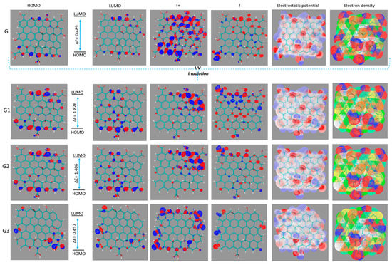HOMO, LUMO orbitals, Fukui, electrostatic potential, and electronic density map of GON (G) and reduced GON forms (G1, G2, and G3).