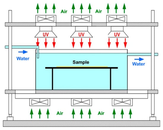 Aging setup was developed by the authors according to the Patent number: RO131897-A2. The system is equipped with a microprocessor that allows the control and monitoring of the process by using of a control panel with touch screen, thermocouples for measuring water and indoor temperatures. The aging system is equipped with 6 Philips CLEO HPA 400/30 SD UNP lamps of 400 W. UV lamps emit ozone-free radiation, mainly in the UVA range with a wavelength between 300 and 400 nm. During the experiments, the water temperature was set at 23 ± 2 °C, the distance between lamps was 30 mm, and the distance between the sample and the lamps was 300 mm. Thus, the obtained intensity of UV radiation in the positioning area of the sample was approximately 45 mW/cm2 [67].