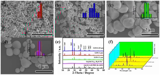 Figure 1f show the photoluminescence (PL) spectra of the GOS phosphor. Under 280 nm excitation, sharp emissions ranging from 300 to 800 nm were observed for the GOS phosphor, which was due to transitions from 5D3,4 excited states to the 7FJ (J = 1–6) ground multiplets as assigned in the literature [1,21], with the ~544 nm green emission (5D4 → 7F5 transition) being the strongest. Among the three samples, GOS-1 μm had the strongest luminescence intensity, GOS-0.45 μm was the next, and GOS-11 μm was the weakest.