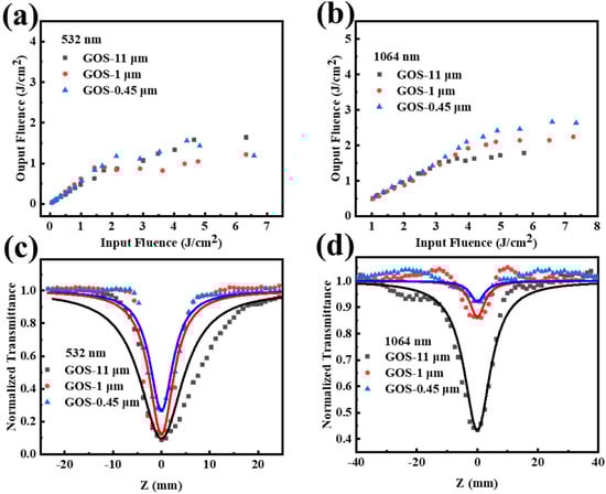 Optical limiting curve of GOS with different sizes in the solution state at (a) 532 nm; (b) 1064 nm; Open-aperture Z-scan data and theoretically fitted curves (solid curves) of GOS-(11 μm–0.45 μm) at (c) 532 nm (d) 1064 nm.