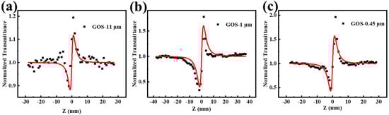 The nonlinear refraction was investigated by the closed-aperture Z-scan approach. Figure 3 show that all the GOS samples exhibit self-focusing signals at 532 nm, suggesting positive refractive indices. The incident fluence of GOS-11 μm, GOS-1 μm, and GOS-0.45 μm are 0.9, 2.6, and 0.9 J·cm−2. The nonlinear refraction signals show that three samples have a self-focusing effect. These results prove that the GOS material has nonlinear optical properties, which are caused by the GOS material itself and the comprehensive results of a variety of effects, such as nonlinear absorption and nonlinear refraction.