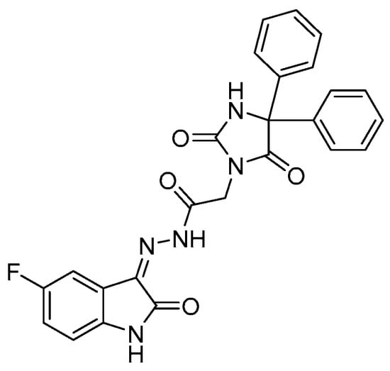 One of our collaborating research groups in King Saud University, Saudi Arabia, previously synthesized 15 new heterocyclic isatin derivatives by hybridizing 5,5-diphenylimidazolidine-2,4-dione conjugated with 5-substituted isatin [27]. Those compounds have been tested for their cytotoxic activity in HeLa, A549, and MDA-MB-231 cells. Compound No. 16 (Figure 1) was the most potent candidate against the cell lines, and showed selective inhibitory activity for EGFR and VEGFR2 (IC50 = 6.17 and 0.09 μM, respectively) [27]. The mechanism responsible for the anti-VEGFR2 activity was assessed in that study by molecular docking simulation for compound 16 and sunitinib, to predict the protein–ligand interactions with the active VEGFR2 site. The findings showed that both compound 16 and sunitinib bind to the same active site on VEGFR2, suggesting that compound 16 could inhibit the same kinase target. Subsequently, compound 16 induced caspase-dependent apoptosis and reactive oxygen species (ROS) production in HeLa cells [27].