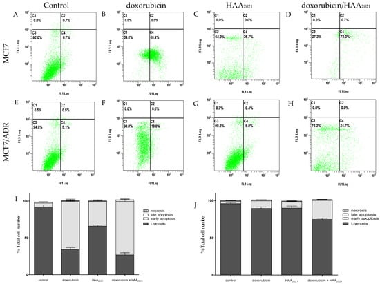 Induction of apoptosis in MCF7 and MCF7/ADR cells treated (72 h) with (A,E) vehicle control, (B,F) doxorubicin (1 µM), (C,G) HAA2021 (0.25 µM), and (D,H) doxorubicin/HAA2021 combination (1 and 0.25 µM, respectively). (I,J) Stacked histograms of the effect of doxorubicin and HAA2021 on MCF7 and MCF7/ADR cells. Results were expressed as mean ± SD, n = 3 × 3 independent experiments. C1: Necrosis, C2: Late apoptosis, C3: Live cells, C4: Early apoptosis.
