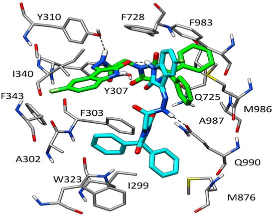 In order to evaluate the potential binding mode of HAA2021 within P-glycoprotein (P-gp), molecular modeling studies were performed employing the robust docking procedure. The cryo-EM structure of human P-gp in complex with the known inhibitor zosuquidar was used for this study (PDB code 7A6F) [28]. In this case, the docking protocol identified a reliable cluster of solutions (see Section 4.2.4 for details). Therefore, the docking pose belonging to this cluster associated with the best estimated binding energy was selected as a representative binding mode. Recent studies demonstrated that, while a single molecule of P-gp substrates, such as vincristine, exclusively interacts with the central pocket of the protein, two different molecules of inhibitors, such as zosuquidar, elacridar, and tariquidar interact with the receptor at the same time, occupying also additional portions of the binding site, which would justify their inhibitory effect [28]. For this reason, we envisioned that two molecules of HAA2021 would bind to P-gp at the same time, as well. Therefore, the predicted HAA2021-P-gp complex was used for a second docking study aimed at predicting the binding disposition within the receptor of a second molecule of the ligand. Once again, a reliable cluster of solutions was identified, and the corresponding best energy pose was selected as the representative binding mode. As shown in Figure 4, the two molecules of HAA2021 are disposed perpendicularly to each other and interact both with the surrounding protein residues and with each other. A first ligand molecule (shown in green in Figure 4) occupies a wide portion of the central pocket of the protein, forming an h-bond with Y310 and a second one with Y307. The diphenylidantoin core of the molecule shows extensive hydrophobic interactions with the side chains of Q725, F728, F983, M986, and A987, while the isatin moiety interacts with I340 and F343. The second molecule of HAA2021 (shown in cyan in Figure 4) occupies the central pocket of the protein with the isatin-derived moiety, which forms lipophilic interactions with F983 and M986, as well as an h-bond with the carbonyl group of the isatin moiety of the first ligand molecule. Moreover, the central portion of the ligand forms an additional h-bond with the side chain of Q990. Finally, the diphenylidantoin core of the second inhibitor molecule extends into the vestibule of P-gp binding site, forming a double π-π stacking with F303 and W323, as well as hydrophobic interactions with I299, A302, M876, and Q990.