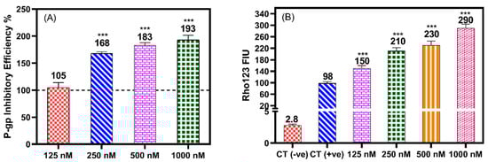 The effect of different concentrations HAA2021 on the P-gp transporter protein in MCF7/ADR cells. (A) The Rho123 efflux assay. Data expressed as mean ± SD of P-gp inhibitory efficiency compared with verapamil as a positive control (100%) as represented as the dashed line to show the decrease of efflux. (B) Accumulation assay. Rho123-FIU was used to compare the Rho123 fluorescence accumulation by HAA2021 with the untreated control (CT −ve), verapamil positive control (CT +ve) in MCF7/ADR, to show the increase of doxorubicin accumulation. *** p < 0.001 indicated the significant difference of treated cells compared with verapamil.