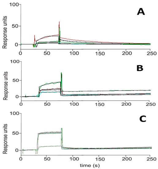 Surface plasmon resonance sensorgram acquired for HAA2021 (A) interacting with Hsp90α and for the positive controls radicicol (B) and 17-AAG (C). Each compound was injected onto the Hsp90α modified sensor chip at six different concentrations in the range of 0.025–4.000 μM. X-axis: time (s), y-axis: response units.