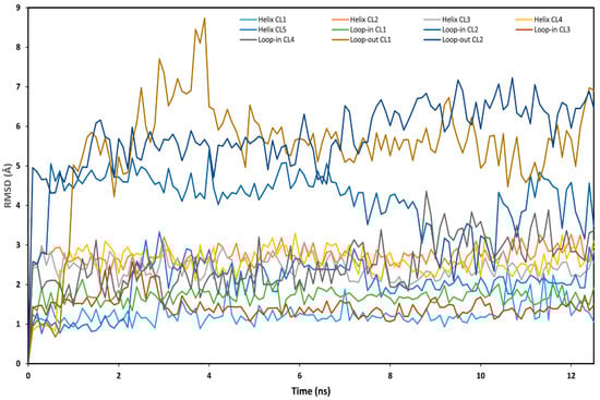 Then, the stability of the 11 different binding modes was assessed by means of MD simulations. The different complexes were subjected to a total of 12.5 ns of MD simulation and the RMSD of the ligand’s position with respect to the original docking pose was analyzed. Although in each complex the ligand showed at least some adjustment of its binding pose, in the case of cluster 2 of the “loop-in” and cluster 1 and 2 of the “loop-out” protein conformation, the ligand showed greater RMSD fluctuation (Figure 7), suggesting that the ligand was endowed with a higher freedom of movement inside the binding site, and thus maintained the binding disposition with a low stability. On the contrary, cluster 1 and 5 of the “Helix” and cluster 1 and 3 of the “loop-in” protein conformation showed the higher stability with and average RMSD value smaller than 2.0 Å.