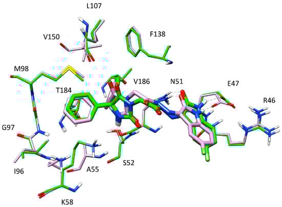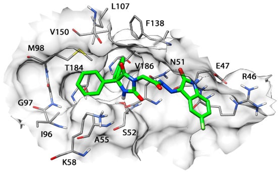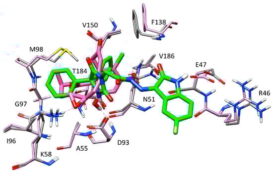 Figure 8 illustrates the minimized average structure of HAA2021 complexed with Hsp90 (obtained from cluster 1 in the “loop-in” protein conformation) in the predicted binding mode obtained from the last 10 ns of MD simulation. The two phenyl rings are placed into a lipophilic cavity of the protein and show lipophilic interactions with I96, M98, L107, F138, V150, T184, and V186. The imidazolindione-2,4-dione ring shows an h-bond with the oxygen backbone of N51, whereas the 3-hydrazonioindolinone fragment shows two h-bonds with the sidechain of N51 and one h-bond with the sidechain of E47. An analysis of these four h-bonds suggests that these interactions are very stable as they were maintained for more the 85% of the whole MD simulation.