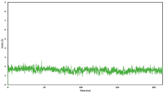 By comparing the predicted binding mode of the ligand with the binding disposition of radicicol (PDB code: 4EGK), it can be seen that the two phenyl rings of HAA2021 are located within the same lipophilic cavity occupied by the cyclic core of Radicicol, which presents h-bonds with K58, T184, and D93 (Figure 9). Although HAA2021 does not form any h-bond within this cavity, it also interacts with an additional portion of the binding site and is well anchored to the protein thanks to the four h-bonds described above, thus justifying its high affinity towards the protein (KD 41.20 nM), albeit reduced with respect to radicicol (KD 1.80 nM). To further demonstrate the reliability of the predicted binding mode of HAA2021, the MD simulation of the corresponding Hsp90-HAA2021 complex was extended to 200 ns. The results confirmed the strong stability of both the binding disposition of the ligand, with an RMSD value below 2.0 Å (Figure 10), and its interactions with the protein (Figure 11).