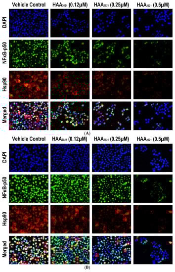 Using the immunofluorescence staining method, the protein expression of NF-κB (green) and Hsp90α (red) were detected in the untreated MCF7 and MCF7/ADR cells. Both proteins showed strong staining intensities (Figure 12). Cells treated with 0.12 µM of HAA2021 disclosed a marked decrease in the Hsp90α, but not the NF-κB, relative to the untreated cells. In contrast, the protein expression of NF-κB declined significantly with the 0.25 µM concentration compared with the non-treated cells and the cells treated with 0.12 µM of HAA2021, whereas the Hsp90α staining intensities were comparable between the 0.25 and 0.12 µM treatments. On the other hand, the lowest significant immunostaining intensities for both proteins were observed with the 0.50 µM compared with all groups. HAA2021 showed more inhibition of Hsp90α and NF-κB in MCF7 compared with the MCF7/ADR cells.
