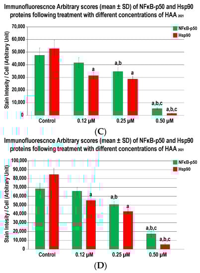 Double localization of NF-κB (green) with Hsp90α (red) by immunofluorescence in the MCF7 (A) and MCF7/ADR cells (B) following treatments with different concentrations of HAA2021 for 72 h (40× objective; scale bar = 10 µm). Arbitrary scores of the immunofluorescent stain intensity/MCF7 cells (C) and MCF7/ADR cells (D) (mean ± SD) for each protein are shown as graph bars (a = p < 0.05 compared with the control untreated cells; b = p < 0.05 compared with the 0.12 µM treatment; and c = p < 0.05 compared with the 0.25 µM treatment).