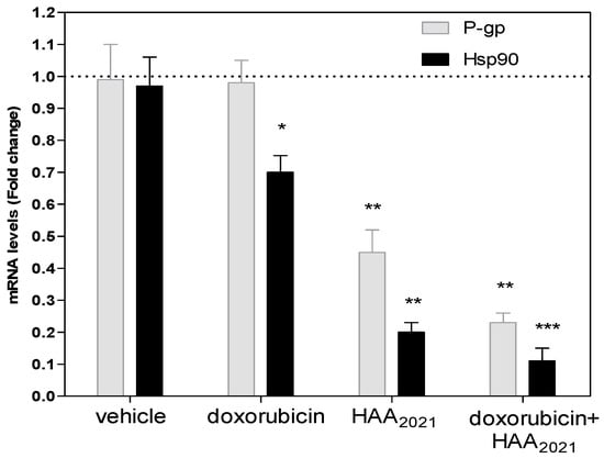 The inhibitory effect (72 h) of vehicle control, doxorubicin (1 µM), HAA2021 (0.25 µM) or their combination on the expression of mRNA of P-gp in MCF7/ADR cells was quantified by RT-PCR. The data represent the mean ± SD of the fold change related to the vehicle control (fold change = 1 dashed line, n = 2 × 2 independent experiments). p < 0.05 (*), p < 0.01 (**), and p < 0.001 (***) were considered significant.