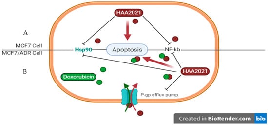 (A) HAA2021 inhibits the expression of Hsp90 and NF-kB in MCF7 cells leading to apoptosis. (B) The chemosensitizing effect of HAA2021 on MCF7/ADR cells to doxorubicin. The combination of HAA2021/doxorubicin enhances the doxorubicin-resistance, downregulates the P-gp protein synthesis and expression, and inhibits its efflux pump action, thus improving the accumulation of doxorubicin, and potentiating its targets on MCF7/ADR cells leading to apoptosis.