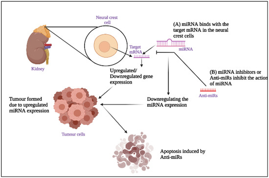 Role of miRNAs and miRNA inhibitor in Neuroblastoma: (A) MicroRNAs (miRNAs) with the RISC complex bind to the target mRNAs in the neural crest cells, thus leading to down-regulation or up-regulation of the target gene expression, which leads to a tumour. (B) Anti-miRs prevent the action of miRNAs by inhibiting the miRNAs from binding with target mRNA so that down-regulating the miRNA expression leads to apoptosis of the tumour cells.