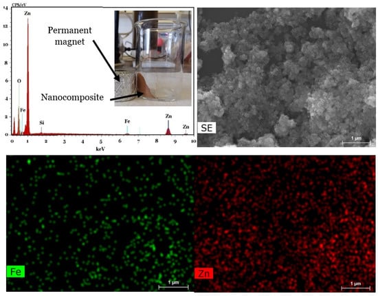 Figure 2 shows the SEM images of the prepared powders, including Fe3O4/Bentonite (Figure 2a), ZnO (Figure 2b), ZnO/Bentonite (Figure 2c), and ZnO/γ-Fe2O3/Bentonite (Figure 2d). Figure 2a indicates the growth of spherical Fe3O4 nanoparticles on the surface of the layered structure of bentonite. Additionally, the precipitated ZnO nanoparticles are spherical, with an average size around 40–50 nm, as observed in Figure 2b. The formation and growth of spherical ZnO nanoparticles on the surface of bentonite are also evident from Figure 2c, being further confirmed by the mapping image of this sample presented in Figure 3. Finally, co-loading of spherical γ-Fe2O3 and ZnO particles on the bentonite surface is observed in Figure 2d, and the mapping index of this sample is shown in Figure 4, which confirms the presence of Zn and Fe elements.