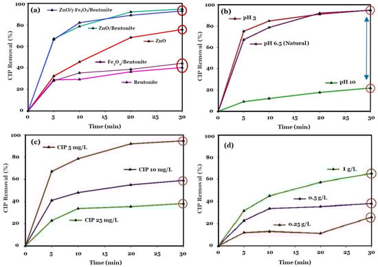 Removal of CIP (5 mg/L) using various types of the applied materials (i.e., bentonite, ZnO/Bentonite, and ZnO/γ-Fe2O3/Bentonite: 0.5 g/L) under near neutral pH (a). Using ZnO/Bentonite (0.5 g/L) under various initial pH conditions (i.e., 3, 6.5, and 10) (b). Removal of various initial CIP concentrations (i.e., 5, 10, and 25 mg/L) by ZnO/Bentonite (0.5 g/L) under initial pH 6.5 (c). The effects of various ZnO/Bentonite dosage (i.e., 0.25, 0.5, and 1 g/L) were also studied for the removal of CIP (25 mg/L) under near neutral pH conditions (d).
