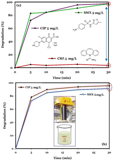 Photodegradation of a mixture of CIP (5 mg/L), SMX (5 mg/L), and CBZ (5 mg/L), using ZnO/Bentonite (0.5 g/L), under near neutral pH and room temperature conditions (a), and photodegradation of CIP (5 mg/L) and SMX (5 mg/L), separately, using ZnO/Bentonite (0.5 g/L), under near neutral pH and room temperature conditions (b).