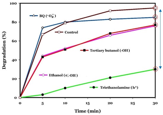 In these equations, kobs is the pseudo-first-order reaction rate constant (min−1), calculated as the slope of the fitted linear regression between ln([PhACs]t/[PhACs]0) and the reaction time (t). In addition, [PhACs]0 and [PhACs]t are the initial concentration of the PhACs and their concentration at time t, respectively [27]. The possible mechanisms involved in the degradation of CIP using photocatalysts were investigated using scavenging experiments. For this, triethanolamine, benzoquinone, tertiary butanol, and ethanol were used as 4 scavengers for holes (h+), superoxide radical anions (·O2−), hydroxyl radicals (·OH), and both electron (e−) and hydroxyl radicals (·OH), respectively [54,55,56].