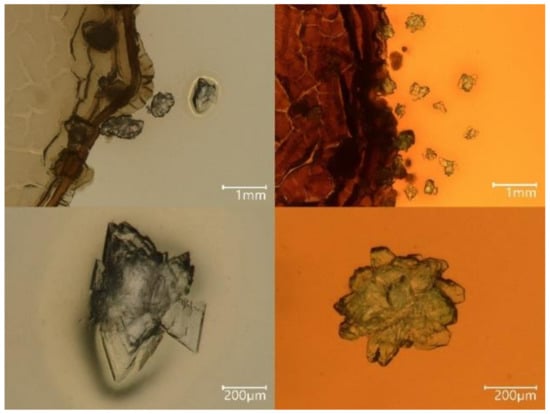 The morphology of crystals precipitated in our experiments varied from microscopic single crystals of different shapes in liquid media to macroscopic aggregates in solid media. Several factors can influence the habit of a crystal—the availability of ions; contaminants; stage of growth; space; etc.—and they can give evidence of the mineralization process []. The different morphologies observed in our experiments may reflect variations in supersaturation (pH, ions concentration) [] or different stages of growth of the crystal []. Furthermore, mineral habits are influenced by media composition [,] and the conditions where the mineral is formed.
