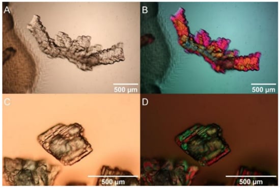 The identification of crystals was based on polarizing microscopy, Raman spectroscopy, and energy-dispersive X-ray (EDX) spectroscopy on an analytical TEM. Polarizing microscopy revealed that the crystals possess clear crystallographic faces and colors varying from white transparent for Ni-free control experiments, to green for experiments with Ni-containing solutions. Under crossed nicols, the grains showed interference colors proving their birefringence and perfect crystallinity (Figure 2).