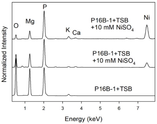The use of struvite mineralization in wastewater treatment has already been implemented [,,]. With the observed nickel struvite biomineralization, a process not only removing high phosphate and magnesium concentrations to avoid eutrophy in wastewater receiving streams and lakes, but also treatment for nickel removal in bioremediation processes becomes feasible [,]. Here, the minerals can be easily precipitated without the need for the cell removal that would be necessary if mere bioadsorption processes were considered []. Thus, and although higher percentages of metal can be bound to cell walls, this will be cost-effective, as no filtering but mere precipitation is necessary. We can show once more that a better understanding of the processes involved in metal homeostasis will not only lead to new findings in cell biology of bacteria, but also allows for applications such as bioremediation [].