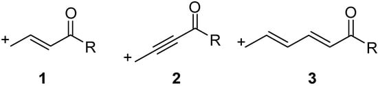 - Ferrié, L.; Amans, D.; Reymond, S.; Bellosta, V.; Capdevielle, P.; Cossy, J. Chemoselective cross-metathesis reaction between electron-deficient 1,3-dienes and olefins. J. Organomet. Chem. 2006, 691, 5456–5465. [Google Scholar] [CrossRef]