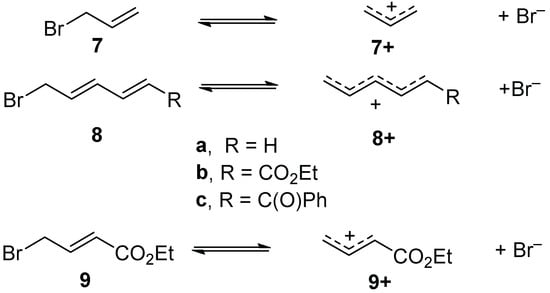 The viability of direct generation of ε-carbonyl cations was initially addressed computationally, using DFT calculations employing the B3LYP functional and 6-311++G(d,p) basis set. The allyl bromide (7) to allyl cation (7+) transformation was the benchmark with which to compare results, as the viability of experimentally verified allyl cation synthetic chemistry has been established, most notably with indium(III) and related catalysts [25,26,27,28]. Compared to this was ionization of 5-bromo-1,3-pentadiene (8a) to give pentadienyl cation (8a+), and the analogous ionizations of ethyl 6-bromosorbate (8b), 6-bromo-1-phenyl-2,4-butan-1-one (8c). In addition, the ethyl 4-bromocrotonate (9) to γ-carbonyl cation species 9+ transformation was included, as an example of a process that has proven difficult experimentally (Scheme 1, Table 1).