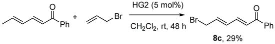 The ester- and phenyl ketone-substituted dienyl bromides, 8b–8c, were chosen as substrates. Ethyl 6-bromohexadienoate (ethyl 6-bromosorbate, 8b) was obtained by literature radical bromination of ethyl sorbate [29]. Phenyl ketone 8c was prepared from 1-phenyl-2,4-butadienone [30], by HG-II-induced cross metathesis with allyl bromide (Scheme 2) [31].