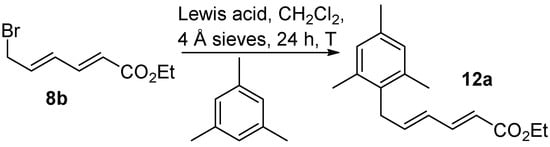 Experimental work began with ethyl 6-bromohexadienoate (ethyl 6-bromosorbate, 8b). Test reactions were undertaken with mesitylene (5 equiv) as the nucleophile, and catalytic amounts (10 mol%) of Lewis acids CuCl, SnCl4, InCl3, GaCl3, and BiI3, in CH2Cl2 with 4 Å molecular sieves (Table 2, Scheme 4). CuCl and BiI3 afforded no product and minimal amounts of product, respectively. Conversely, GaCl3, InCl3, and SnCl4 gave more significant amounts of conversion to 12a over 24 h, although small amounts of starting material remained. Repetition of the reactions at reflux afforded complete starting material consumption, but also gave some polar decomposition byproduct. Ultimately, GaCl3 at room temperature proved to be the most successful Lewis acid, giving 12a in a 68% yield. Reducing the amount of GaCl3 to 5 mol% decreased the yield noticeably (47%), while an increase to 15 mol% made a negligible difference (67% yield). Omission of the 4 Å molecular sieves also gave a decrease in the yield of 12a (51%, 58% brsm).
