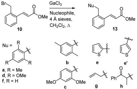 The benzylic bromide analogue, 10, also reacted under the optimized conditions, again at reflux (Scheme 6, Table 4). Mesitylene afforded 13a in a 73% yield, with no evidence of even trace amounts of isomeric products present. p-Xylene (13b, 76% yield), 1,3-dimethoxybenzene (13c, 77% yield), and 1,3,5-trimethoxybenzene (13d, 75% yield) behaved analogously. Thiophene worked well, again affording an isomeric mixture of C-2 and C-3 substitution products (13e and 13e′, 92% yield, 13e:13e′ = 71:29). The aromatic nucleophiles could be extended to benzene itself (13f, 72% yield), although a greater amount of GaCl3 catalyst (30 mol%) was required.