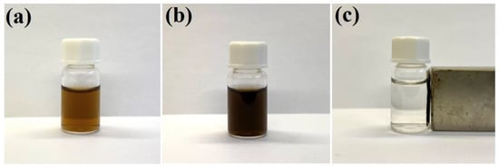 Photographs of: (a) the sol of silver nanoparticles (before mixing with the sol of Fe3O4 nanoparticles), (b) the mixture of the sol of Ag nanoparticles and the sol of Fe3O4 nanoparticles after sonication and shaking for 45 min, and (c) the sol of (Fe3O4@Ag)@SiO2 nanostructures after application of a strong external magnetic field. The used vessel has a volume of 2 mL. The sols were not diluted before the photo was taken.